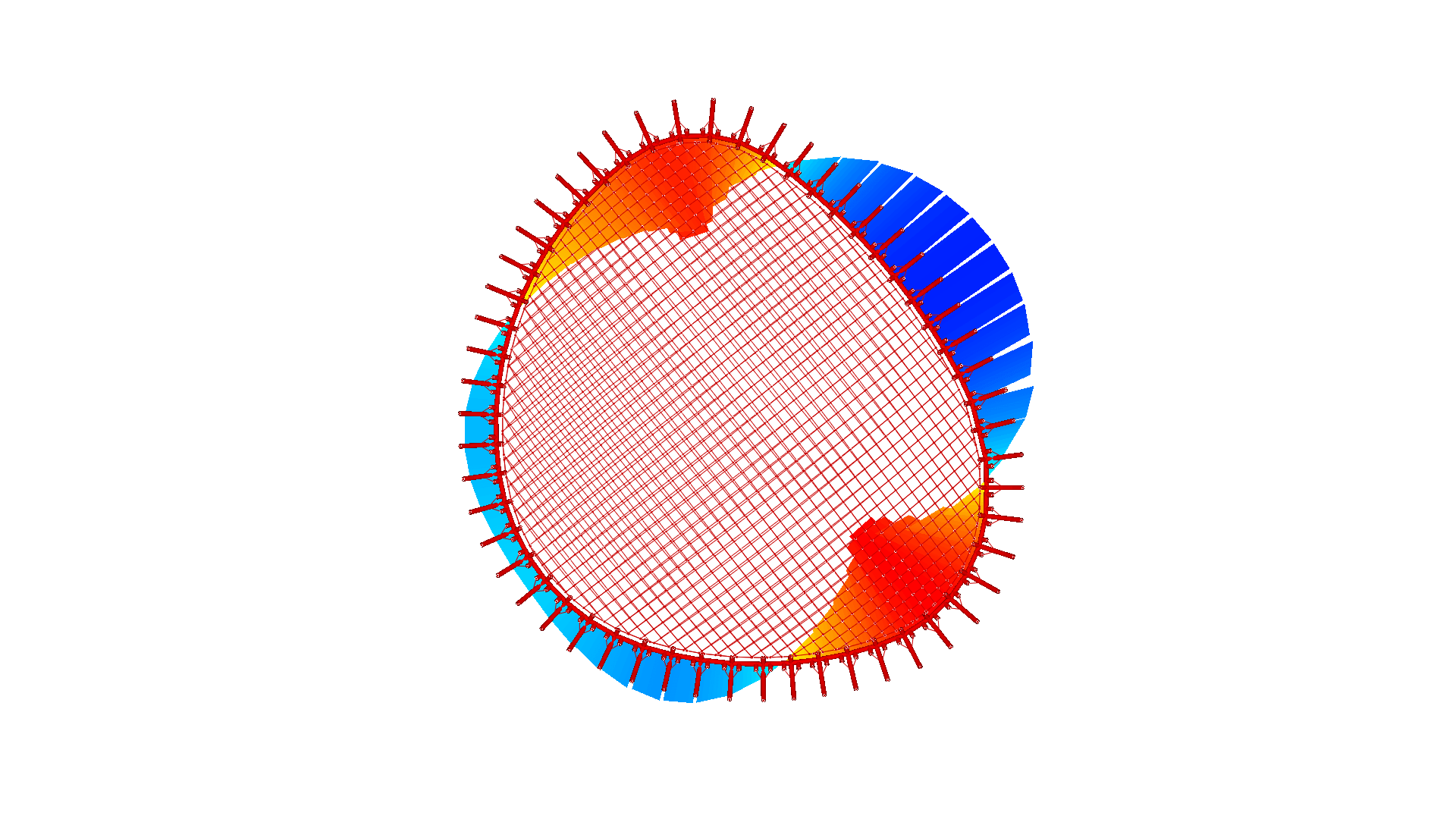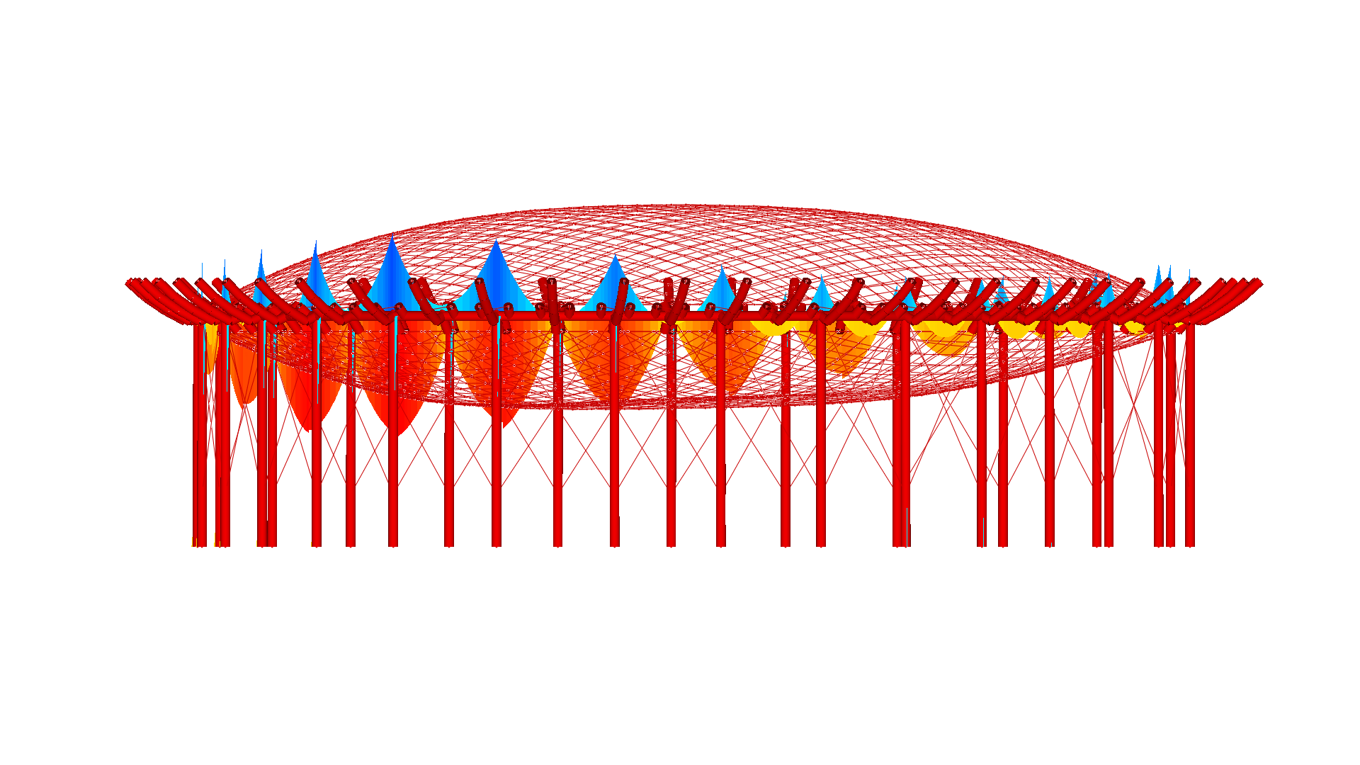 In Easy.Vol the internal pressure is changing its direction and size depending on the loaded area. Therefore a precise model is described by Easy.Vol, where the consideration of gas-laws enables the realistic behavior of the internal pressure: only in this case the membrane stresses get the correct size.