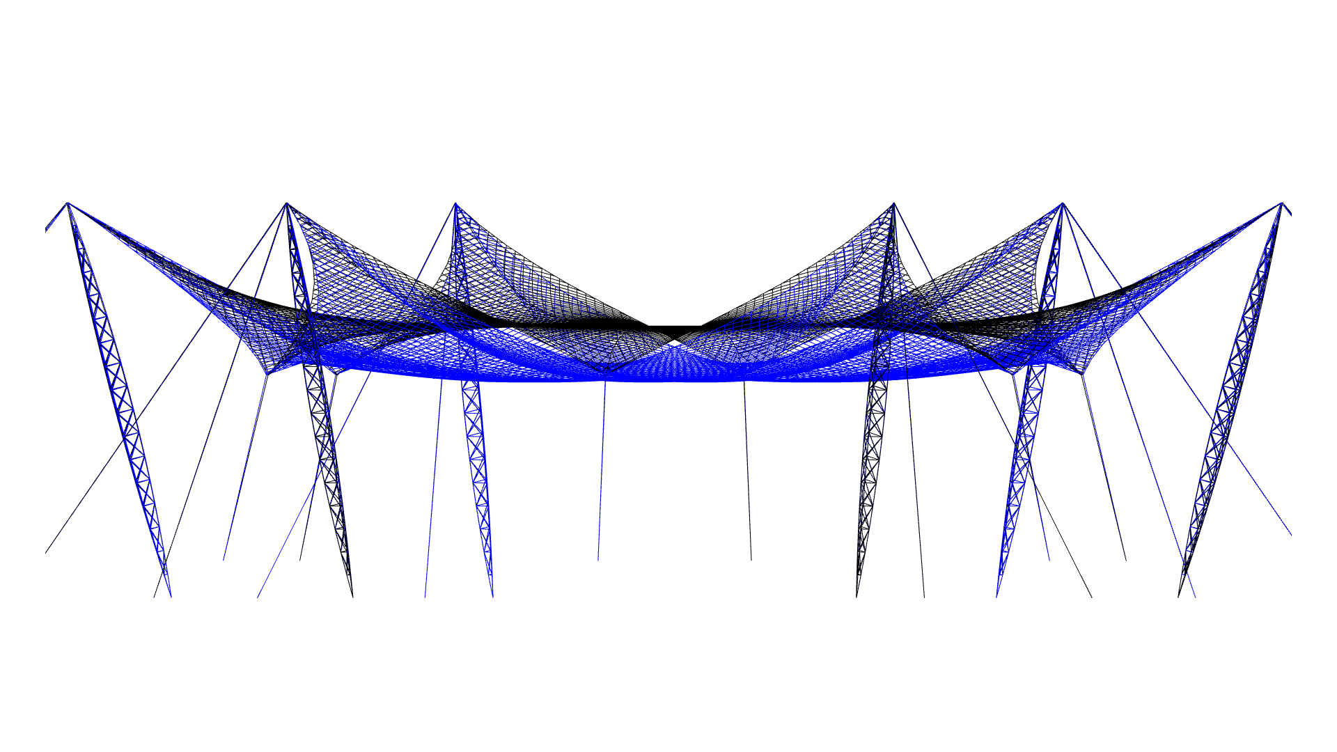 Additionally, given the large amount of data required to model all lightweight structure models, the graphical representation of the deformation, force and stress results must be able to be easily controlled to highlight the relevant data. The right picture shows a membrane structure with 63 partial areas and an extension of 360m x 150m.