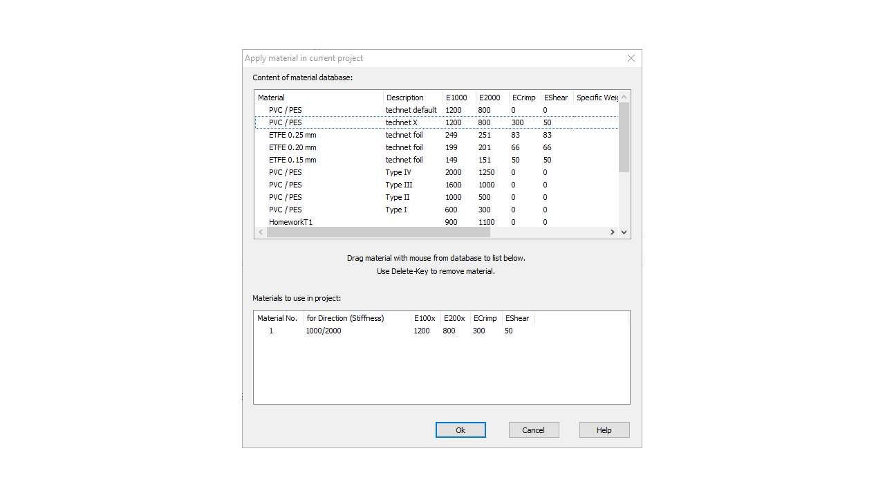 Easy supports precise material laws with finite triangular membrane elements with warp/weft stiffness including transverse extension and shear stiffness e.g. for foils and also simplified material description for orthotropic fabrics by warp/weft stiffness, where non-linear material behaviour can be considered.